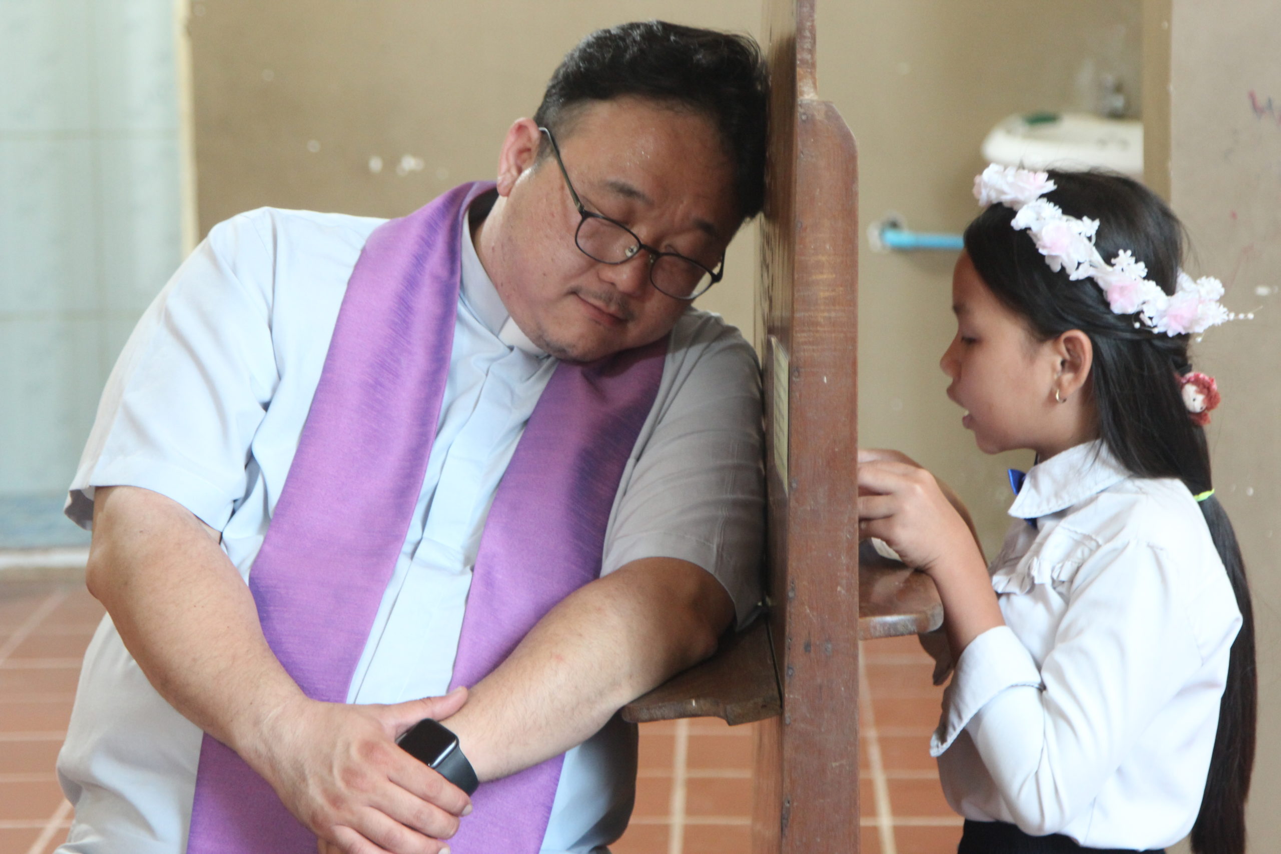 កុមារ១០នាក់ ដែលមានអាយុចាប់ពី១០ឆ្នាំដល់១៥ឆ្នាំ នៅព្រះវិហារសន្តអន់ទន់ ព្រែកដាច់ ស្រុកលើកដែក ខេត្តកណ្ដាល នៃមណ្ឌលសកម្មភាពទន្លេមេគង្គ ទទួលអគ្គសញ្ញាព្រះកាយព្រះគ្រីស្តលើកដំបូង នាថ្ងៃទី២៤ វិច្ឆិកា ២០១៩។